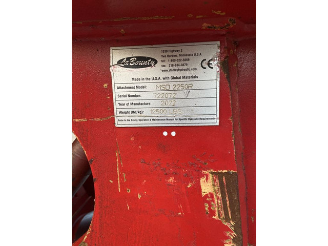 LaBounty MSD2250RTechnische gegevensWerkgewicht ²5800 kgBekopening, max.760 mmBeklengte760 mmOliedebiet511 l/minWerkdruk275 - 380 barOliedebiet rotatie30 - 42 l/minMax. werkdruk rotatie138 - 172 bar
